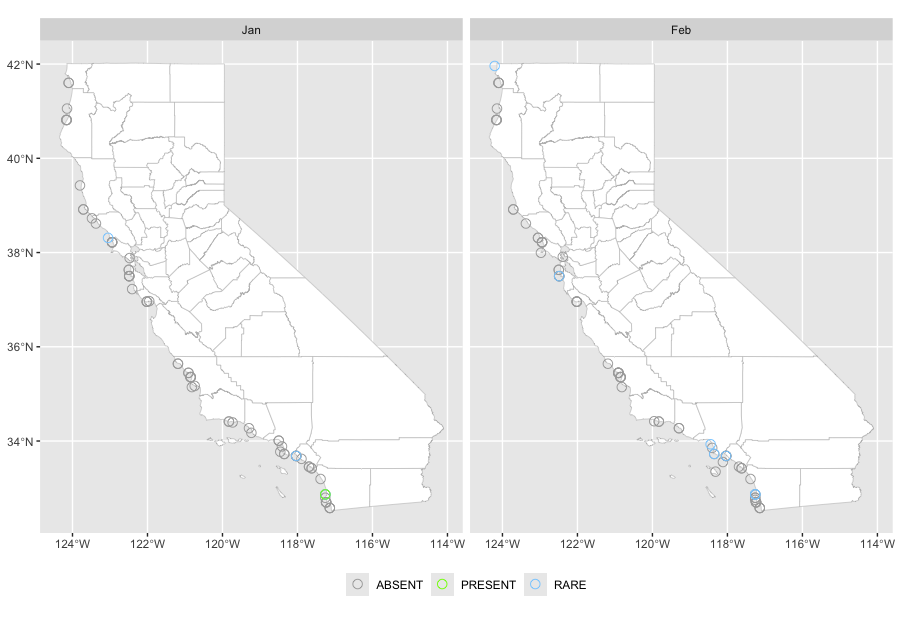 | 2026-02-24 | Pillar Point Harbor | 37.49883 | -122.48753 | 0 | ABSENT | 0.5 | RARE |