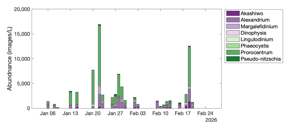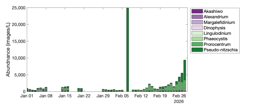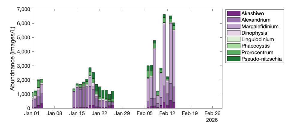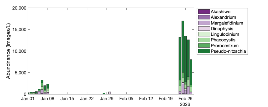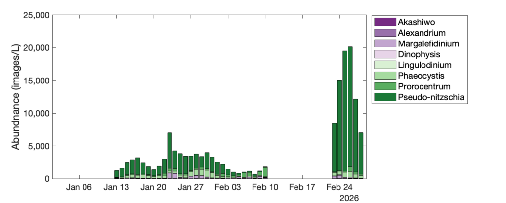 - The Imaging Flow Cytobots (IFCBs) – robotic microscopes recording hourly observations at a subset of HABMAP piers and an offshore location at the Del Mar mooring recorded high Pseudo-nitzschia abundances at the end of February, consistent with HABMAP, with Del Mar reaching 15,000–21,000 images/L (roughly 30,000–52,500 cells/L), Scripps Pier at 5,000–16,000 images/L (roughly 10,000–40,000 cells/L), and Stearns Wharf at 10,000–41,000 images/L (roughly 20,000–102,500 cells/L). Unfortunately, the Newport Beach IFCB was not operational through much of this time period. IFCBs deployed through January-February confirm that Akashiwo, Margalefidinium, and Prorocentrum were detected across all active stations, and a substantial Margalefidinium bloom was also captured at Santa Cruz Wharf in February.