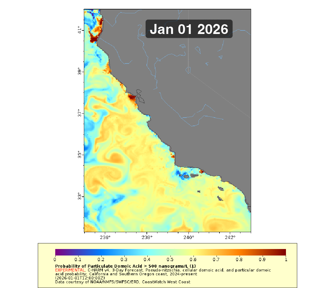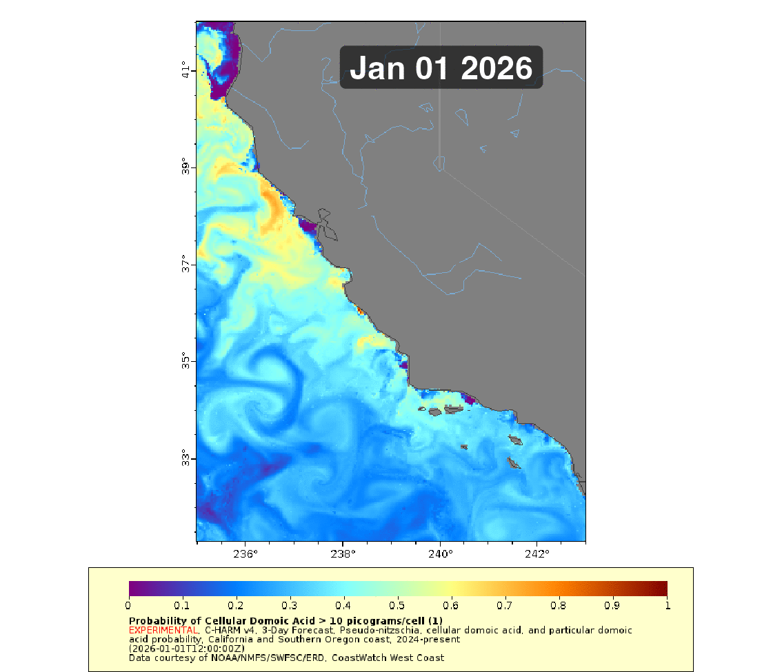 Pseudo-nitzschia is a neurotoxin producing diatom that is observed along the California Coast. Blooms of this phytoplankton can be detrimental to surrounding marine ecosystems. This forecast provides a probability for where the concentration of cells in the water exceed the threshold of a Harmful Algal Bloom ( > 10,000 cells/L).