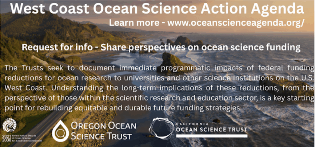 You are invited to complete this brief survey to share your perspectives. Please feel free to distribute this email widely to individuals, programs, or institutions that may be experiencing programmatic impacts from federal funding reductions to ocean research programs. Survey responses will be compiled and analyzed by the Trusts. All information received through this survey and subsequent analysis will be shared in an aggregated format; no information shared publicly will be traceable to any individual respondent or institution.